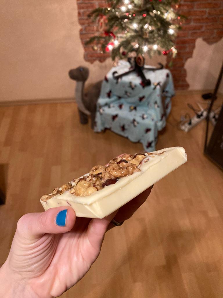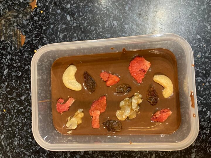 Jak jsem zmiňovala u pekanových košíčků, zbyla mi cukrové směs, kterou jsem následně na pánvi smíchala s oříšky. Část té směsi jsem položila na pečicí papír a nechala vychladnout – je možné to chodit ukusovat. Druhou část jsem použila na výrobu „domácí“ čokolády. Ve spíži jsem měla zbytek bílá čokolády, kterou jsem si rozpustila ve vodní lázni. Následně jsem na Pinterestu našla skvělý trik – vzala jsem si od 0,5 litrového mléka krabici a uřízla tomu spodek. Vznikla z toho cca 2 cm vysoká vanička, do které jsem následně nalila rozpuštěnou čokoládu, které jsem pak vyskládala ořechy obalené v cukrové směsi. Následně jsem to dala do mrazáku ztuhnout a po dvou hodinách jsem vyndala hotovou „domácí“ oříškovou čokoládu. Z tetrapak formičky to šlo bez problémů. vyndat. Tip: na větší čokoládu by byly potřeba 2 čokolády na rozpuštění a krabice od džusu / litrového mléka.