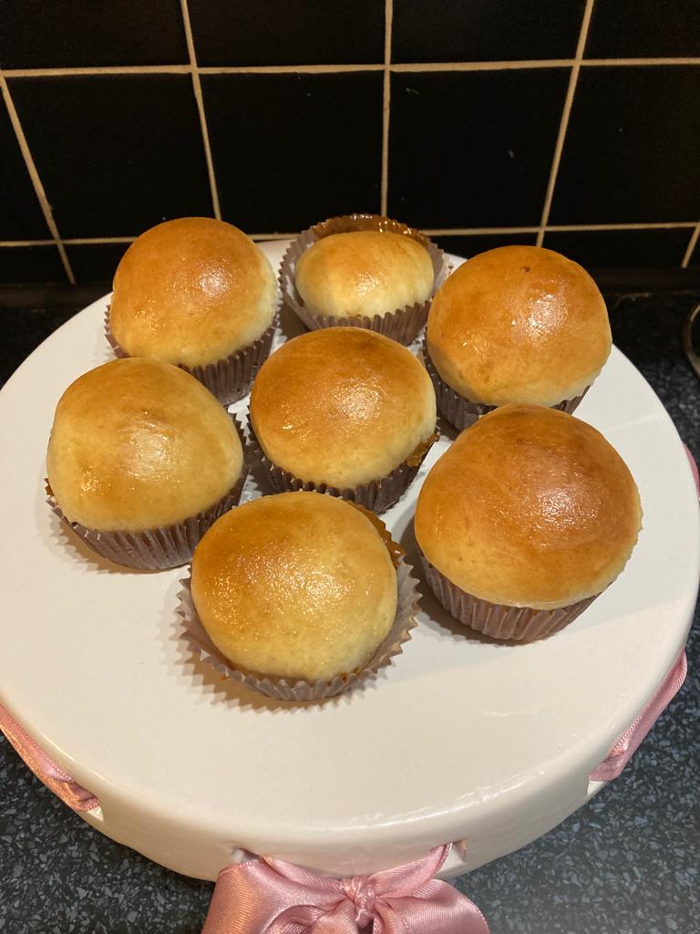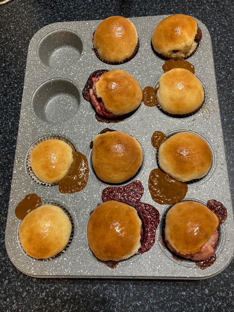 Koblihy pečené jako muffiny Náplně: višňová marmeláda / nutella / dulce se leche + potřeno máslem s rumem