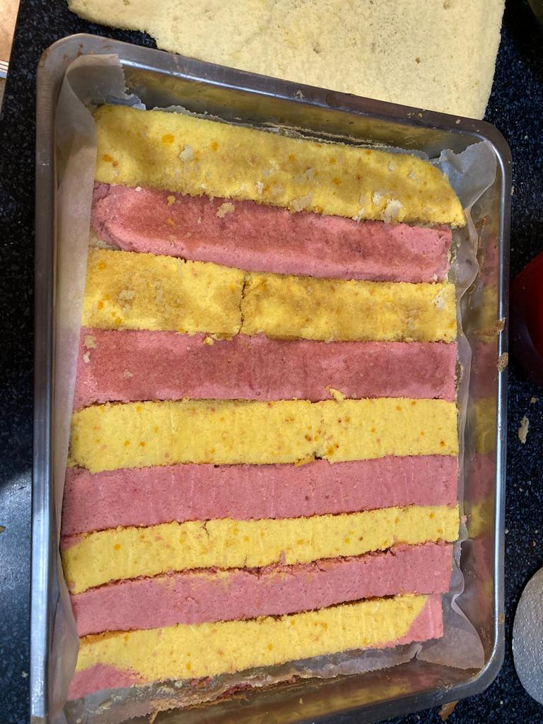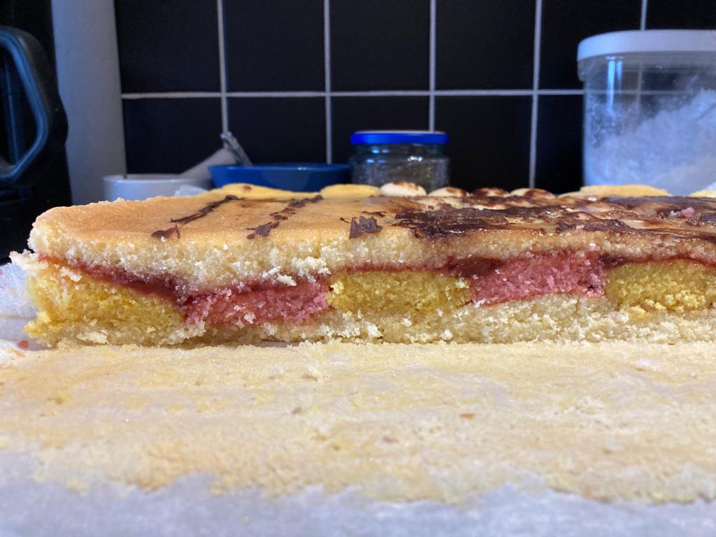 • podle receptu se má světlé těsto upéct jedno a následně rozkrojit -> výsledky těsto ovšem je docela tenké a vzhledem k lepkavosti se půlí velmi obtížně. Ideální bude upéci těsta dvě a jedno umístit naspod, druhé nahoru