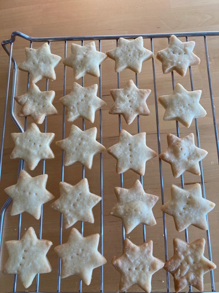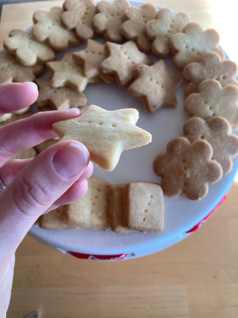 Kolega z práce se zmínil, že bych někdy mohla upéct shortbread sušenky – takže když jsem na Pinterestu viděla tento jednoduchý recept ze tří ingrediencí, řekla jsem si proč ne. Těsto je opravdu hodně máslové, takže při válení a vykrajování začíná postupně „téct“. Je potřeba tedy pracovat co nejrychleji. Recept je jednoduchý a stačí se ho držet, pak je úspěch zaručen. Pekla jsem sušenky na dvě várky a bohužel jeden plech jsem dala na vyšší rošt než obvykle, takže se mi sušenky trochu přismahly. Nejsou spálené, ale jsou o chlup hnědší než by měly být. Chuti to nijak ale neubralo.